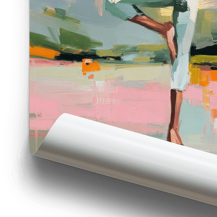 Olieverfschilderij van een vrouw in een yogahouding op één been, de armen opzij gestrekt, in zachte pastelkleuren roze en geel. De achtergrond toont een harmonieus landschap in blauwe en groene tinten. De impressionistische penseelvoering en vintage stijl stralen rust, evenwicht en elegantie uit. Ideaal voor yogafans, retroliefhebbers…