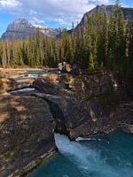 Landschapsopname van de rotsformatie Natural Bridge in het Yoho National Park in British Columbia, Canada in de Rocky Mountains met een wilde rivier omgeven door ruige kliffen en naaldbos en bergen op de achtergrond in de middagzon in de herfst.