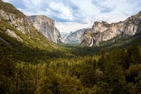Ansel Adams maakte de tunnelview een beroemd uitzichtpunt in het nationale park Yosemite. Je hebt er een mooi uitzicht op Yosemite Valley, El Capitan, Bridalveil Falls en de Half Dome. Natuurlijk evenwichtig warme foto met groen, blauw en grijze rotsen.