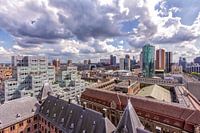 Heerlijk uitzicht over de skyline van Rotterdam gezien vanaf de klokkentoren van het Stadhuis Rotterdam