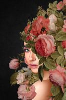 Een romantisch, zomers en ietwat surrealistisch portret van een vrouw, verscholen achter rozen.