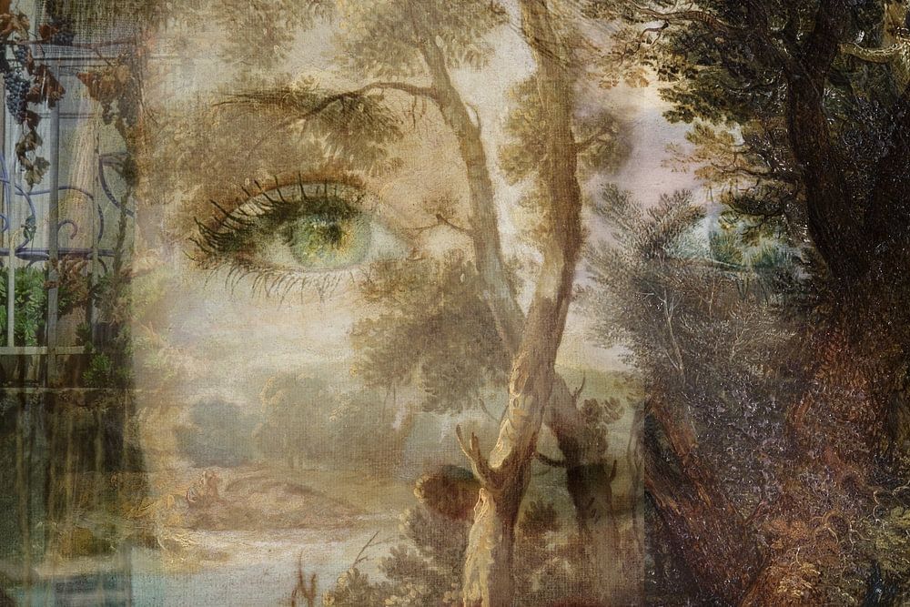 Foto's en delen van foto's digitaal verwerkt tot een sfeervolle compositie van een vrouwenhoofd in een landschap met diverse figuurtjes en een T-shirt aan een balkon met de tekst ' You make me happy '.