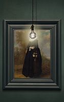 Het portret heb ik digitaal op een groene (iets beschadigde) muur gehangen, in een moderne zwarte lijst, en vervolgens heb ik op een hele onhandige plaats een vintage lamp opgehangen. Mijn excuses daarvoor, ik had in deze afbeelding geen plek meer vrij om de lamp op een geschiktere plek op te hangen.