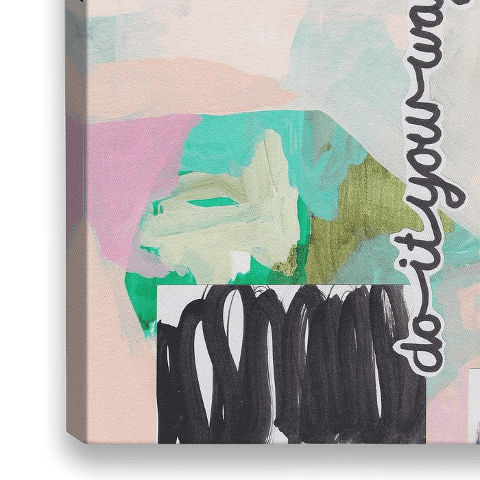 'Your Way' is een mixed media collage met de letters 'Do it your way'. Dit werk staat voor eigenheid en het zelf inrichten van je ideale leven. Het nodigt uit om je unieke pad te volgen en je leven op jouw manier vorm te geven.