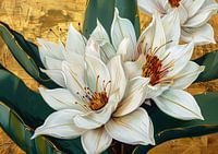 Yucca Schilderij - Dit bloemenschilderij toont de statige schoonheid van de Yucca bloemen, uitgelicht tegen een rijke gouden achtergrond.