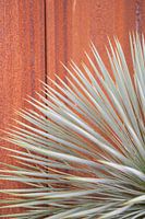 Een prachtige grijs groene yucca met als achtergrond een roestige muur. Puntige bladeren van de vergrijsde yucca maken een mooi contrast met de orange bruine kleur van de muur.