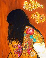 Acrylinkt schilderij van een jong meisje met veel kleurige vrolijke bloemtatoeages. In deze moderne tijd zijn er veel mensen die zich laten tatoeëren. Het kan iets met een betekenis zijn of gewoon iets wat je leuk vind.