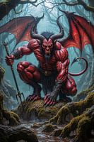 In de mist van een oeroud bos knielt een machtige gestalte met rode huid en zwarte hoorns. De vleugels van de duivel spreiden zich uit als levende schaduwen, terwijl het zwakke licht van de schemering weerkaatst op de punten van zijn drietand. Tussen mos, water en nevel blijft hij onbeweeglijk staan, maar de lucht trilt, alsof de hel zelf door hem ademt.