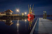 Garnalenkotter ZK47 aan de dam van de binnenhaven in Zoutkamp op een ijskoude windstille nacht. Mooie reflectie van de kotter en het leugenbankje links in het spiegelgladde water. Rechts op de voorgrond is een opgevroren drijvende steiger.