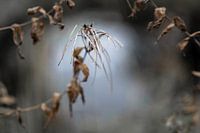Zaadcapsules van wilgenhout (Epilobium) tegen een wazige natuur achtergrond, wabi sabi-concept, symbool van groei en verval, kopieerruimte, geselecteerde focus, smalle scherptediepte