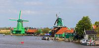 Nederlandse windmolens langs de rivier De Zaan ten noorden van Amsterdam, Nederland.