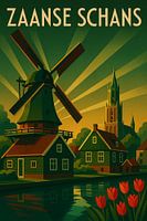 Haal de schoonheid van traditioneel Nederlands erfgoed in huis met deze Zaanse Schans muurkunstprint. Het kunstwerk met historische windmolens, tulpenvelden en charmante huizen is ontworpen in een art-deco vintage reisposterstijl. Het gedurfde kleurgebruik - rijk groen, diep rood en goudgeel - benadrukt de tijdloze schoonheid van deze beroemde Nederlandse bezienswaardigheid. Het tafereel weerspiegelt de culturele rijkdom van Nederland, waardoor het een perfecte keuze is voor bewonderaars van Nederlandse geschiedenis en design. Deze Zaanse Schans print combineert nostalgie met verfijning en voegt warmte en karakter toe aan elk interieur. Of je deze iconische locatie nu hebt bezocht of gewoon van vintage-stijl reiskunstwerk houdt, deze print is een betekenisvolle manier om de charme van Nederland te vieren. Het is een prachtige toevoeging aan woonkamers, kantoren of elke andere ruimte die culturele inspiratie nodig heeft.