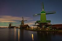 De traditionele molens van de Zaanse Schans in de nacht langs het water met sterren aan de hemel en in de verte het Noorderlicht in Zaanstad in Nederland. Noorderlicht (Aurora Borealis) dat zichtbaar is in Nederland is een heel zeldzaam fenomeen.