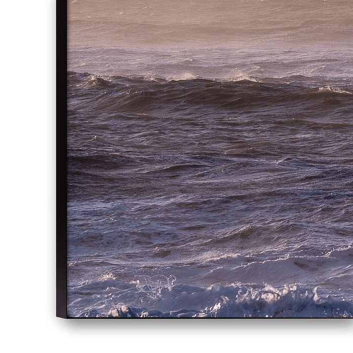 Deze prachtige foto vangt de krachtige maar serene beweging van de branding in de vroege ochtend. Het warme licht van de opkomende zon kleurt de lucht en het water in zachte tinten, terwijl de golven hun energie tonen. Een groep meeuwen zweeft boven de oceaan, wat het beeld een vleugje vrijheid geeft. Een indrukwekkend kunstwerk voor liefhebbers van de zee en rustgevende landschappen.
