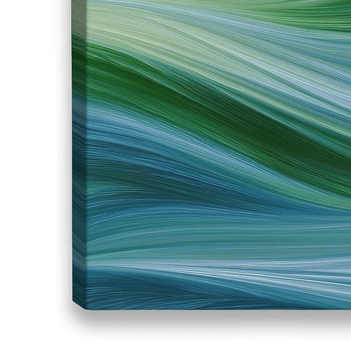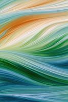Zachte golven in groen, blauw en warm oranje vloeien naadloos in elkaar over en vormen een harmonieus ritme. Elke penseelstreek benadrukt de vloeiende beweging, terwijl de subtiele kleurovergangen een rustige, verfijnde uitstraling geven.