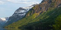 Bijzonder in Noorwegen is om het lange avondlicht in het voorjaar en de zomer mee te maken. Deze foto heb ik begin juni tegen tien uur 's avonds genomen, een moment waarop het in Nederland al redelijk donker is, de zon is dan net onder. In Noorwegen, bij het meer Lovatnet bij Loen, ging de zon pas rond kwart over 11 's avonds onder. Op het moment van de foto was er dan ook nog een heel mooi, zacht licht op de hellingen te zien van de ondergaande zon. Het was er heel sereen en stil en je hoorde eigenlijk alleen het constante geruis van de watervallen.