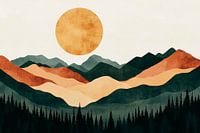 Een warm kleurenspel van zachte aardetinten en levendig zonlicht dat de majestueuze bergen omlijst, nodigt de kijker uit om te dromen. De harmonieuze combinatie van natuur en licht creëert een rustgevende sfeer. Ideaal voor de woonkamer om een uitnodigende en ontspannen oase te creëren.