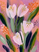 Dit abstracte bloemenkunstwerk heeft delicate witte bloesems die tevoorschijn komen uit expressieve penseelstreken en gelaagde texturen. Zachtroze, koraal en groene tinten mengen harmonieus en creëren een frisse en opbeurende sfeer. De losse compositie en schilderkunstige details roepen het gevoel op van een rustig lenteveld, gevuld met…