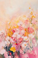 Dit schilderij toont een prachtige weergave van bloeiende bloemen in zachte, warme kleuren. De roze, gele en witte tinten komen samen in een dromerige en etherische sfeer, wat het gevoel geeft van een zonovergoten veld vol bloesems. Dit kunstwerk straalt sereniteit en vreugde uit, ideaal om een vleugje natuur in je huis te brengen. Het is perfect voor in de woonkamer of slaapkamer, waar het een rustgevende en uitnodigende uitstraling creëert. De impressionistische stijl van dit werk zorgt voor een ontspannen sfeer en maakt het tot een tijdloze toevoeging aan je interieur.