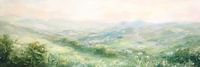 Het landschap nestelt zich tegen de heuvels in zachte groentinten, terwijl de mist zachtjes over de toppen glijdt. De lucht ademt rust uit en de zachte overgangen tussen licht en schaduw nodigen uit tot dagdromen. Hier smelten hemel en aarde samen in harmonie, alsof de natuur haar eigen lied neuriet.