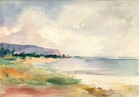 Een impressionistische aquarel toont een rustig kustlandschap met een grashelling die zachtjes afdaalt naar een zandstrand. De vegetatie varieert in tinten groen, bruin en geel, terwijl donkergroen het strand omzoomt. Daarachter strekt zich kalm water uit in blauwe en grijze tinten met fijne golven. Links op de achtergrond rijst een…
