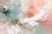 Een abstract schilderij in pastel koraal, turquoise en witte accenten straalt sereniteit uit. Een tijdloos abstract werk dat rust en zachtheid oproept.