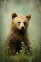 Een bruine beer zit tussen het hoge gras en kijkt met een rustige, bijna dromerige blik naar voren. De combinatie van de zachte kleuren en de kalme houding geeft dit beeld een vredige en natuurlijke uitstraling.