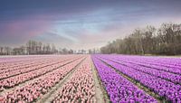 Bloeiende hyacinten gefotografeerd bij zonsondergang op een zomerse dag in Lisse. Rijen met bloemen in de Bollenstreek. Bloemenvelden met pastelkleurige hemel.