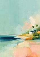 Een abstract, impressionistisch schilderij toont een strandlandschap met bleek blauwgroen water en een zandkust in zacht geeloranje tinten. Rechts staat een klein wit huis met een donker dak, omringd door groene palmbomen. De lucht erboven is lichtblauwgroen met zachte, diffuse penseelstreken. De zichtbare penseelstreken en het gereduceerde kleurenpalet creëren een kalme, vredige sfeer waarin minimalisme en nabijheid tot de natuur elkaar ontmoeten. De compositie oogt licht, luchtig en harmonieus, ideaal voor liefhebbers van subtiele, impressionistische strandmotieven.