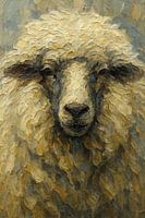 Dit schilderij toont een schaap recht van voren, in warme, gelaagde penseelstreken die haast tastbaar aanvoelen. De dikke structuur van de verf benadrukt de wollige vacht, met tinten van okergeel, crème en schaduwen in grijsblauw en donkerbruin. De ogen zijn nauwelijks zichtbaar, wat een mysterieuze kalmte oproept. Het dier kijkt niet…