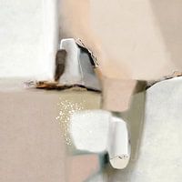 Abstracte compositie met een verscheidenheid aan texturen, vormen en gedempte kleuren, voornamelijk in beige, lichtgrijze en crèmekleuren.