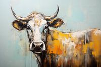 Het kleurenpalet, bestaande uit rustgevende blauwtinten en warme aardetinten, weerspiegelt de vredige harmonie tussen de natuur en haar bewoners. De krachtige penseelstreken en de vloeibare verftechnieken geven het kunstwerk dynamiek en leven, waardoor het lijkt alsof de koe elk moment uit het canvas kan stappen.