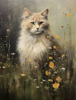 In dit sfeervolle kunstwerk zit een zachte, pluizige kat te midden van een veld vol gele en witte bloemen. De kat, met een lichte, bijna crèmeachtige vacht en een kalme, observerende blik, wordt subtiel verlicht door het zachte daglicht dat door de bloemen heen schijnt. De gele bloemen voegen een warme, uitnodigende tint toe aan het beeld, terwijl de kat in perfecte harmonie lijkt te zijn met zijn omgeving. Zijn ogen stralen een gevoel van kalmte en bedachtzaamheid uit, waardoor het geheel een bijna dromerige sfeer krijgt. De combinatie van het rustige dier en de levendige bloemen zorgt voor een uitgebalanceerde compositie die serene rust en schoonheid uitstraalt. Het kunstwerk nodigt de kijker uit om stil te staan bij de eenvoudige momenten van stilte in de natuur.
