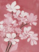 Een speelse en stijlvolle bloemcompositie die doet denken aan het werk van Matisse, met vloeiende penseelstreken en een warme, roze achtergrond. De delicate witte en roze bloemblaadjes brengen een gevoel van lichtheid en optimisme, alsof de lente net is begonnen. Deze digitale creatie is geïnspireerd op klassieke schilderkunst, maar met een eigentijdse, grafische flair.