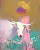 Dit kunstwerk toont een vrouw en een witte stier in een veld vol bloemen, omhuld door een achtergrond waarin een gouden cirkel gloeit als een zon of innerlijk licht. De vrouw draagt een ketting met een centraal medaillon en kijkt neerwaarts in stilte. De stier is versierd met een bloemenkrans, wat hem verbindt met de aarde en de seizoenen. De compositie straalt rust uit, maar ook een zekere plechtigheid.