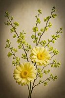 Twee lichte, gele bloemen openen zich tussen frisgroene knoppen. Het zachte licht en de neutrale achtergrond geven het geheel een serene, frisse uitstraling, alsof de lente zichzelf rustig ontvouwt.