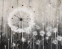 Paardenbloemen tegen een vervaagde achtergrond die doet denken aan een mistige ochtend. De paardenbloemen, uitgevoerd in monochrome zwart-wittinten, zijn met lange stelen op het doek geplaatst, waarbij hun zaadpluisjes zich lijken te verspreiden in de wind. De achtergrond is sereen, met subtiele penseelstreken die een atmosferische…