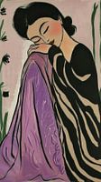 Haar gesloten ogen en vredige uitdrukking suggereren een moment van diepe introspectie of vreedzame slaap. Ze is gehuld in een opvallende jurk met paarse en zwarte strepen, die dynamisch…