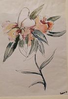 In Zachte Ontmoeting vangt de kunstenaar een intiem moment in de natuur. Een bloem opent zich terwijl een vlinder zacht neerstrijkt, alsof de wereld even pauzeert. De subtiele kleuren en vrije lijnvoering versterken het gevoel van kwetsbaarheid, rust en aandacht. Dit werk nodigt uit tot vertragen en stil genieten.