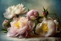 Een dromerig stilleven van zachte pioenrozen in wit en roze, vol delicate details en een vleugje tijdloze elegantie. De volle bloemblaadjes en subtiele lichtval geven een romantische, schilderachtige sfeer die warmte en verfijning toevoegt aan elk interieur. Perfect als stijlvol accent in woonkamer, slaapkamer of een klassieke eetkamer.