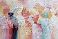 Het schilderij Zachte Silhouetten straalt een serene, dromerige sfeer uit door het gebruik van zachte pastelkleuren en subtiele texturen. De menselijke figuren zijn figuratief weergegeven, maar niet gedetailleerd; ze bestaan uit brede, vloeiende kwaststreken die hun vormen slechts in suggestie oproepen. Elke figuur is opgebouwd uit een…