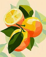 De achtergrond in pasteltinten ondersteunt de frisse uitstraling van de vruchten, terwijl het groen van de bladeren voor een levendige aanvulling zorgt.