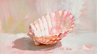De schelp ligt diagonaal op een abstracte ondergrond en wordt gekenmerkt door haar golvende structuur en zachte pasteltinten van roze, oranje en wit. De textuur van de schelp wordt versterkt door de nauwkeurige…