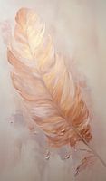 Zachte Veer - Dit subtiele kunstwerk toont een prachtig gedetailleerde veer in zacht, zalmroze tinten die naar Peach Fuzz neigen, met een hint van goudfolie die enige luxe aan de compositie toevoegt. De stijl lijkt een evenwicht te vinden tussen realisme en abstractie, waarbij de achtergrond vervaagt in zachte, vloeiende kleurovergangen die rust uitstralen.