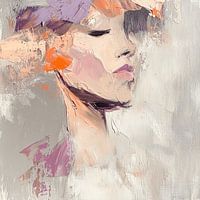 De dikke, dynamische penseelstreken in warme perziktinten, zachte lavendel en spatten van helder oranje voegen diepte en beweging toe. De randen van het portret vervagen geleidelijk, alsof haar aanwezigheid zowel tastbaar als vluchtig is. De neutrale achtergrond versterkt dit effect en laat de figuur opgaan in een spel van licht en textuur.