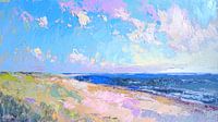 De hemel is een zachte mengeling van blauwe, witte en zachtroze tinten, weergegeven in brede, vloeiende penseelstreken die het vluchtige karakter van wolken en wind vangen. De zee is…