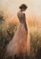 Een serene vrouw staat in een zachte, vloeiende jurk, haar figuur baadt in het gouden licht van een ondergaande zon. Aardetinten vermengen zich naadloos met zachte accenten van oudroze en koraal in het landschap om haar heen, besprenkeld met korte, delicate penseelstreken. De scène is enigszins vervaagd, maar roept een gevoel van rust op, terwijl de natuur haar zachtjes omarmt in warme tinten.