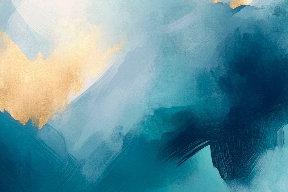 Zachte golven van waterblauw en intens donker trekken de kijker mee in een rustgevende droomwereld. Gouden lichtaccenten fonkelen als zonnestralen die door het water breken. Dit artistieke stuk brengt een ontspannen sfeer in elke slaapkamer of woonkamer en nodigt je uit om te dromen en tot rust te komen.