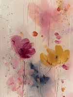 Een dromerige mix van kleur en gevoel komt samen in deze luchtige bloemencompositie. De schildering straalt rust en optimisme uit, met een speelse balans tussen dieproze en zonnig geel. Lichte penseelstreken en spetters zorgen voor een bijna zwevende sfeer, alsof de bloemen net uit een droom zijn geplukt. Een kunstwerk dat zowel subtiel…