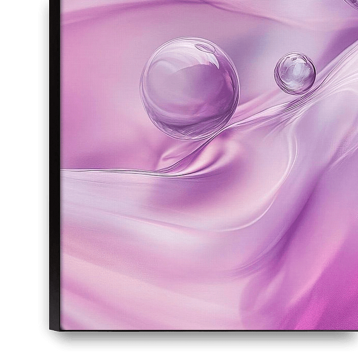 Delicate violette golven dansen harmonieus rond glinsterende bubbels die schitteren als kleine juwelen. Deze zachte kleuren en creatieve vormen geven elke kamer een rustgevende sfeer. Ideaal voor een slaapkamer of een moderne woonkamer, het creëert een ontspannen en dromerige sfeer die uitnodigt om te blijven hangen.